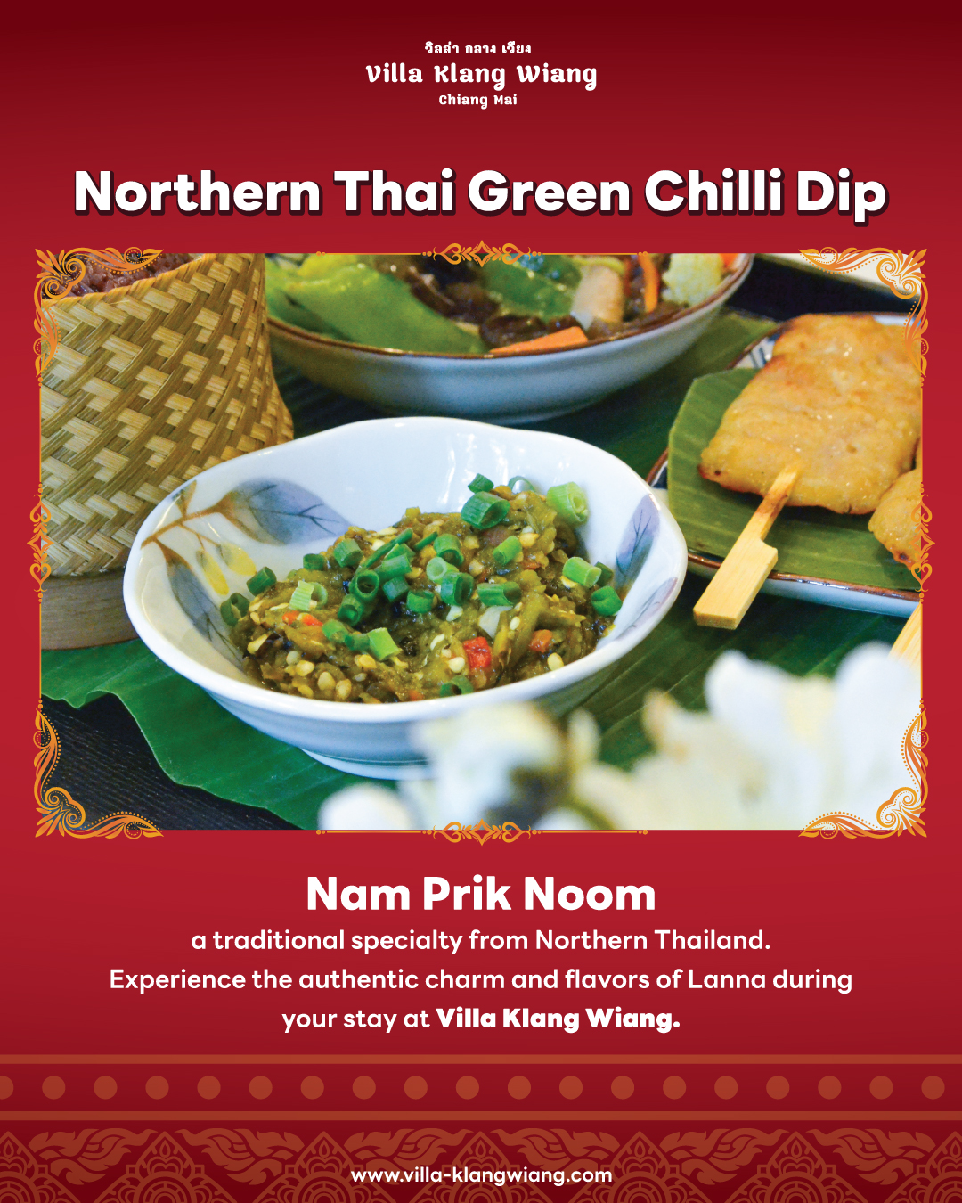 It is traditionally enjoyed with sticky rice, fresh vegetables and crispy pork rinds, reflecting the warm and simple beauty of northern Thai living.